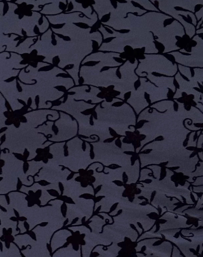 The Sevila dress features a bodycon silhouette that falls mini length with long, flared sleeves and a boat neckline in a stretch mesh fabric. In a flocked petal navy print, it comes fully lined with lettuce hem detail.