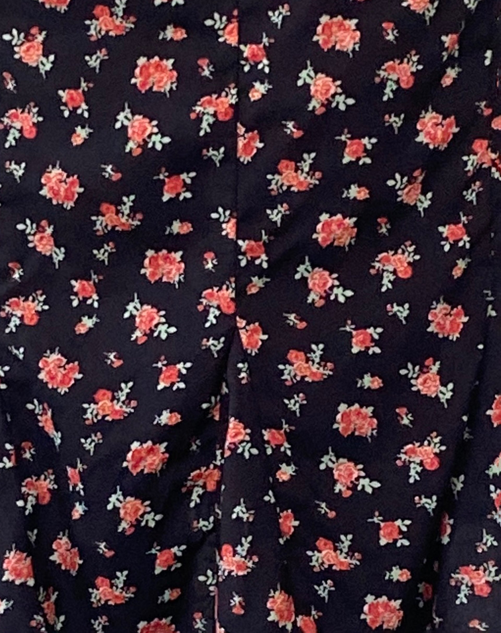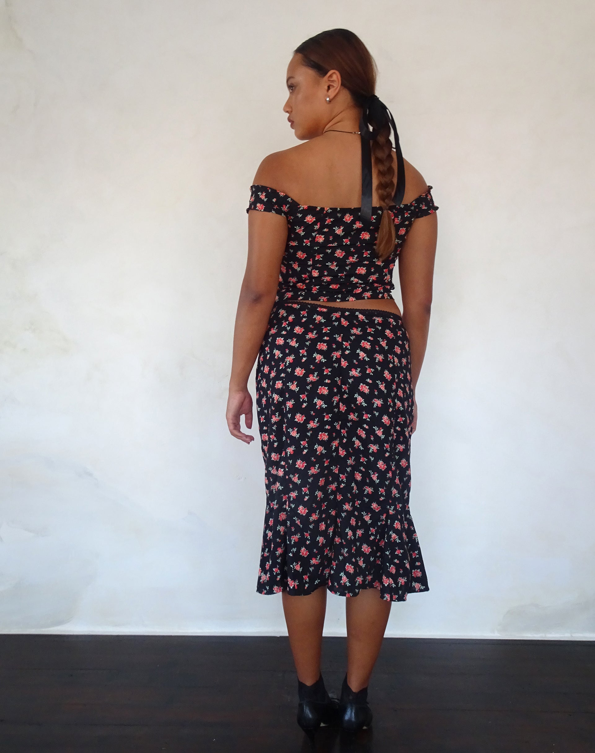 Black midi skirt in a floral rose print. We love to match with our Uhuy Top.