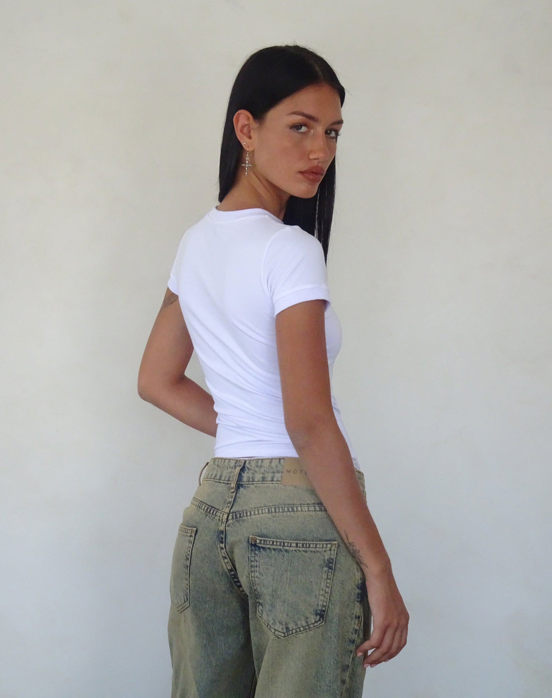 In a white jersey fabric, the Sutin tee features short sleeves, a crew neckline and a slim fit with a bow graphic in pink. Paired with our Roomy jean.
