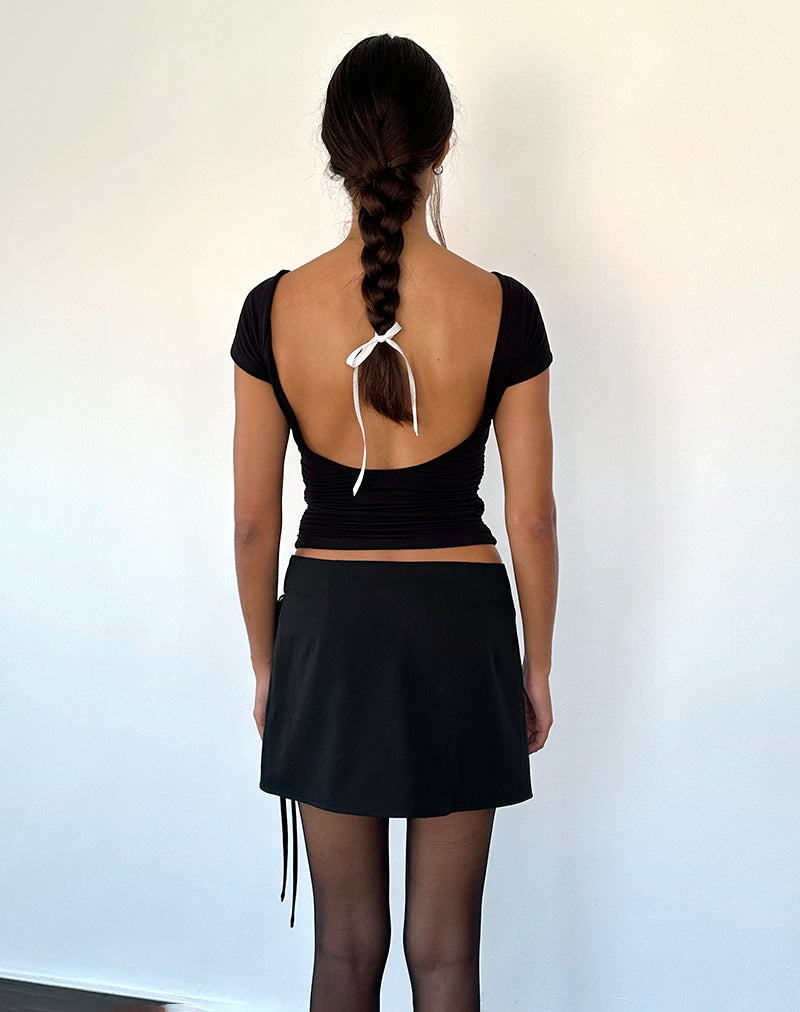 Your new mini skirt fave. Tanix features in black with low waist and wrap style with tie finish.