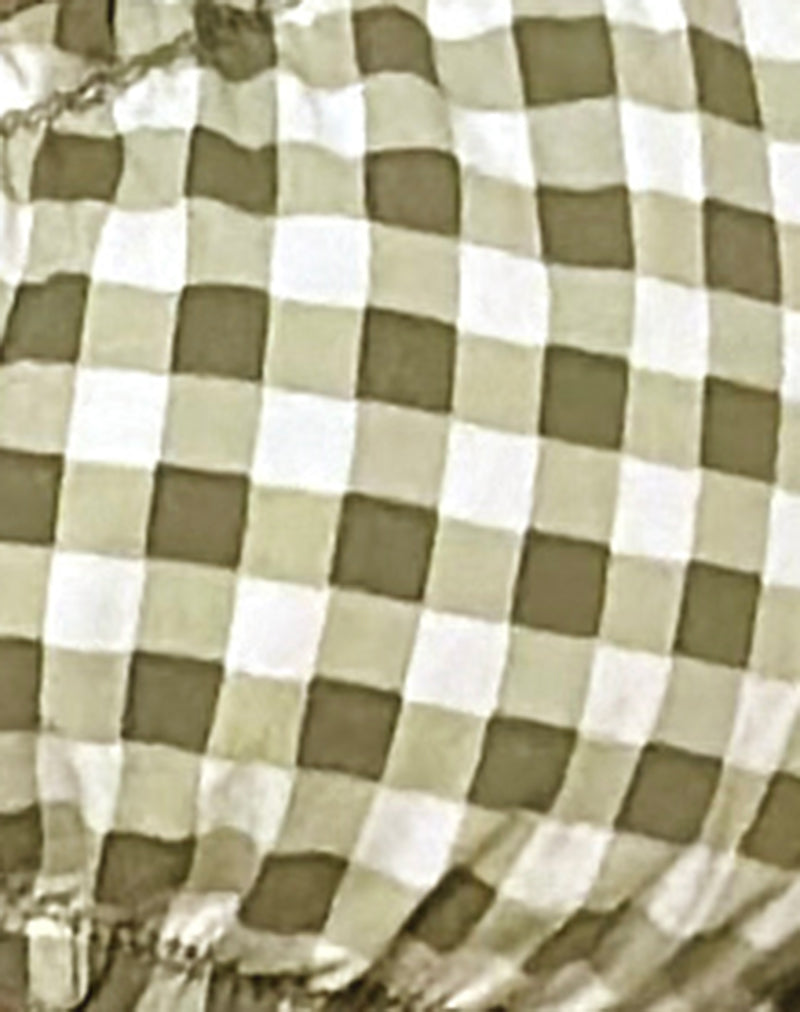The Tiga bralette in tonal olive gingham print on a poplin fabric base. Featuring an extreme cropped design with adjustable cami straps and plunge neckline. Detailed with ruffled edges. Complete the set with matching Laboxe shorts.
