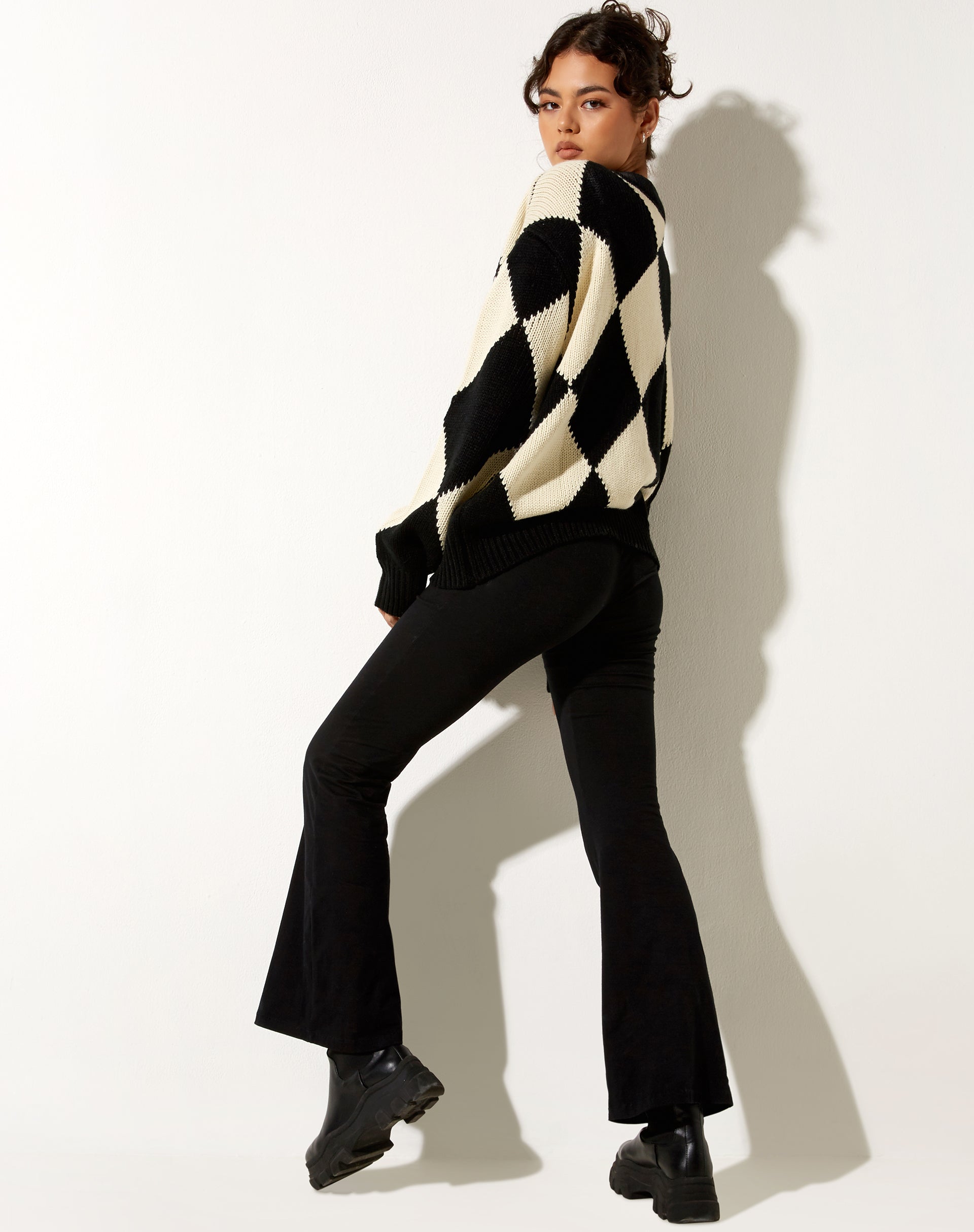 In a soft knit, the Uriela cardigan features long sleeves with a V neckline and button up front in a black and off white harlequin print. We love to wear with our Parallel jeans.