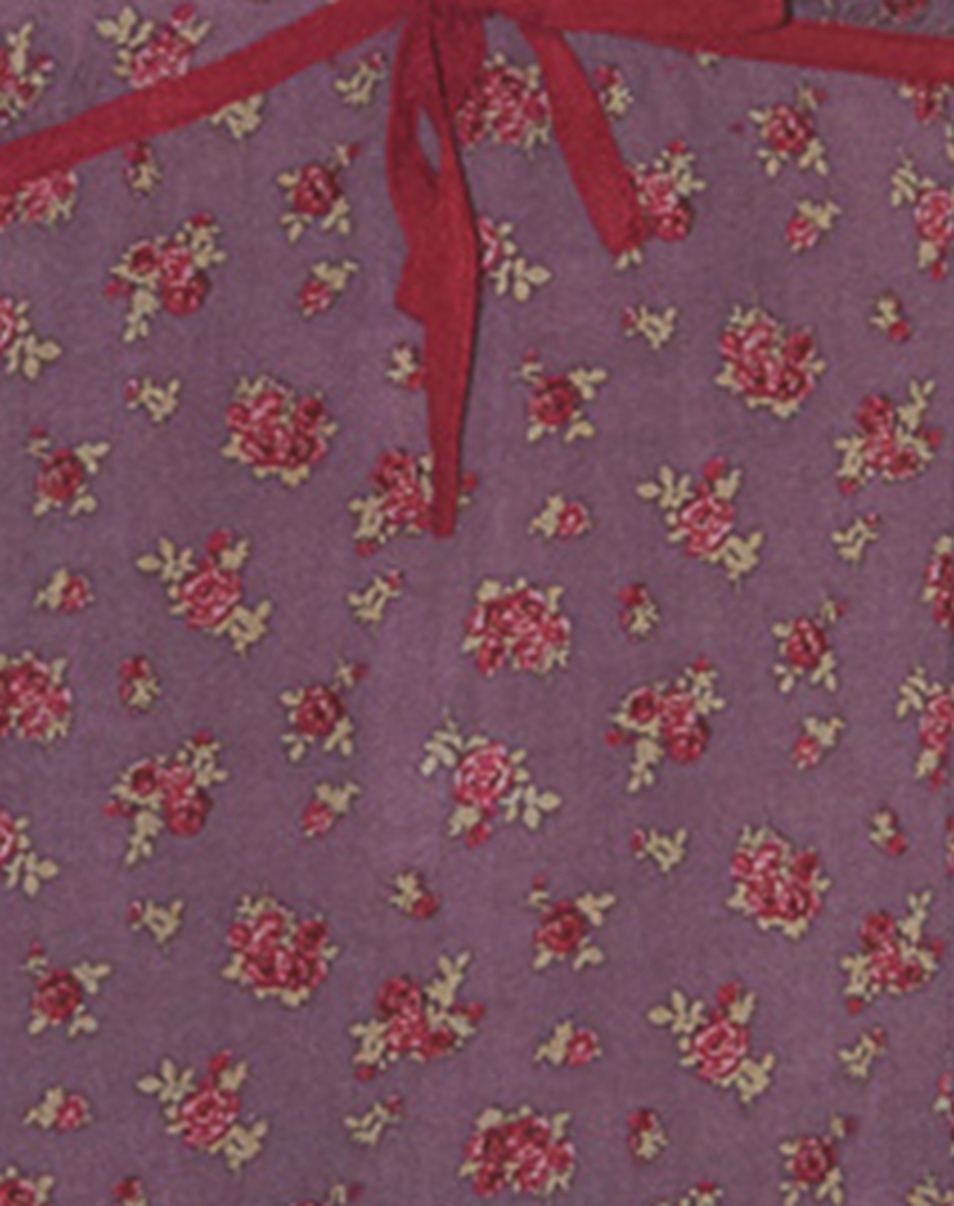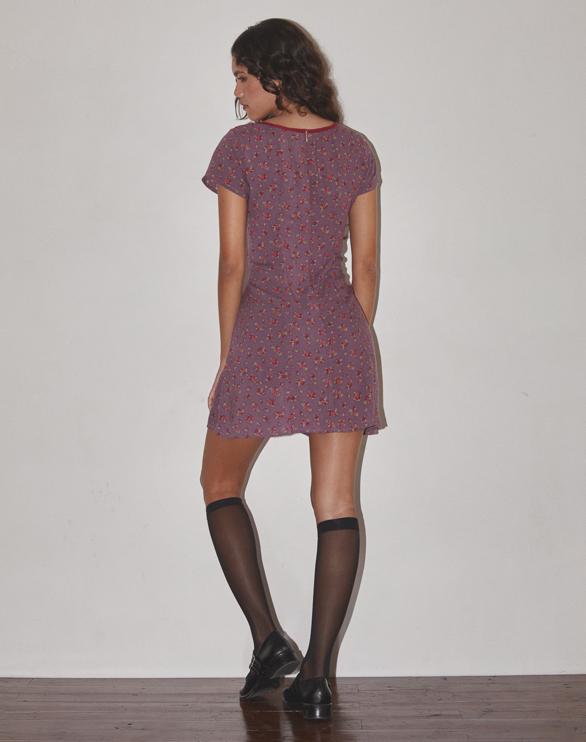 Mini length dress with cap sleeves, V neckline with contrast binding and a loose flowy skirt, in a muted purple base print with all over ditsy floral in pink tones in a non stretch lightweight viscose. Finish the look with a chunky loafer.