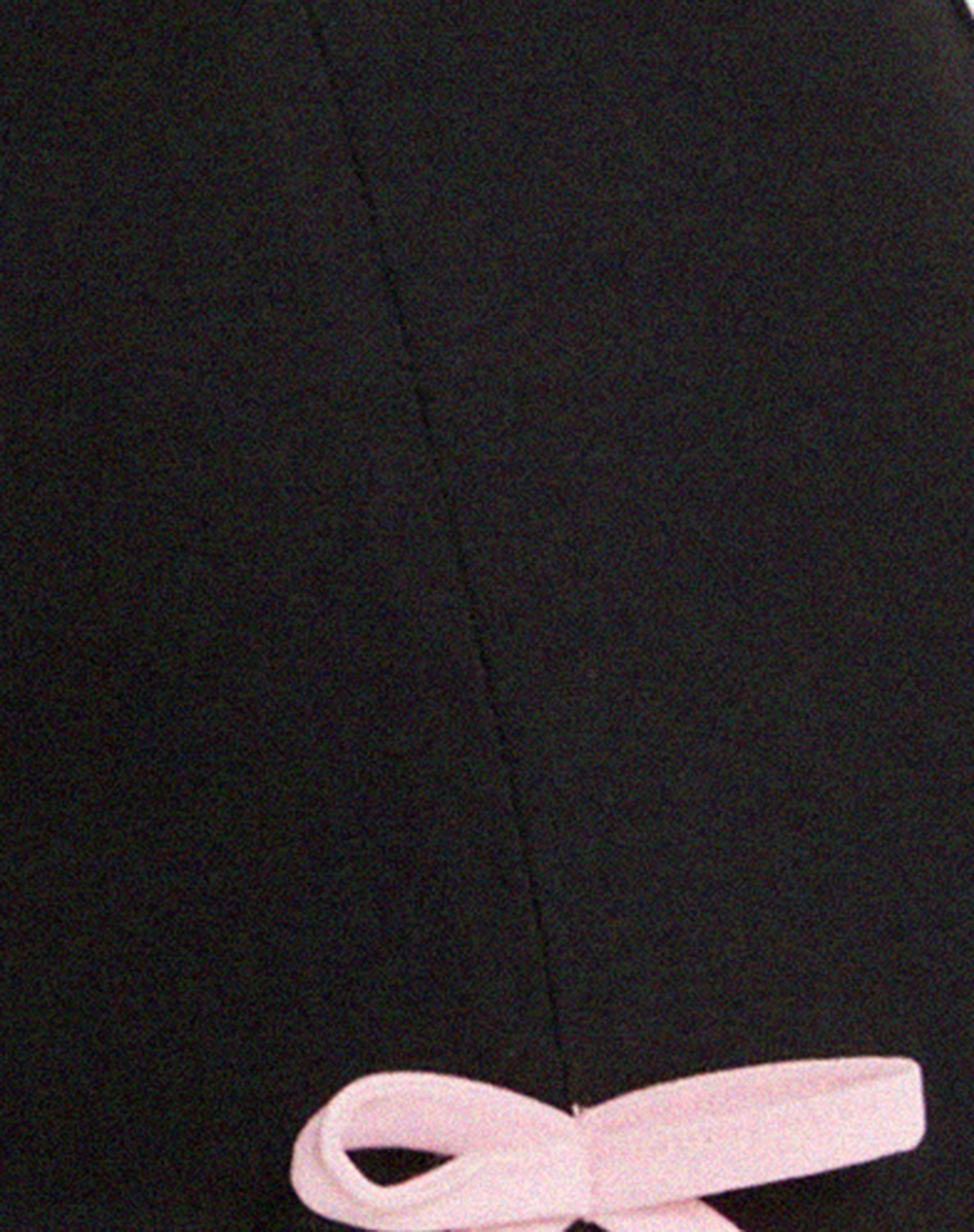 The Wei skirt is perfect for weekend styling. In black, it features a mini, bodycon fit with a side slit and pink bow detailing. Match it up with our Kenaya crop.