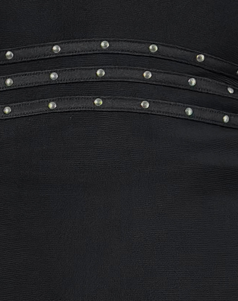 The Xaviera dress in black mesh fabric. Featuring unlined long sleeves in a mini style, with low v plunge neckline. Finished with a lettuce hem and studded band waist line.